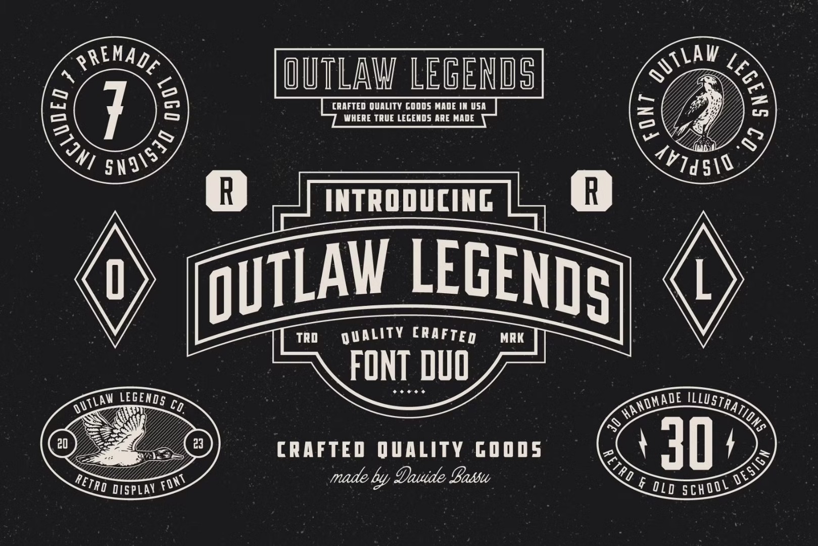 Meet the Outlaw Legends Font Duo, a captivating combination of serif and sans-serif fonts that evoke the spirit of the industrial era. This dynamic duo is perfect for branding, logos, t-shirt designs, and more. With its bold and rugged charm, it's sure to add a touch of rebellion to your visual identity. As an added bonus, you'll get 7 premade logo templates to jumpstart your design process, compatible with both Photoshop and Illustrator. Plus, enjoy a collection of 30 handmade old school illustrations that can be used to elevate your designs - provided in both vector format and isolated PNG files for easy customization.