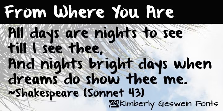 Meet From Where You Are, a charming hand-display font that's sure to add a touch of whimsy to your designs. This unique typeface, published by Kimberly Geswein Fonts, has a playful, handwritten feel that's perfect for adding personality to headlines, quotes, and even short paragraphs of text. The irregular letterforms and subtle variations in thickness give From Where You Are a relaxed, conversational vibe that's hard to resist. Whether you're looking to add some charm to your blog, create eye-catching social media graphics, or simply make your text-based designs stand out, this font is sure to hit the spot.