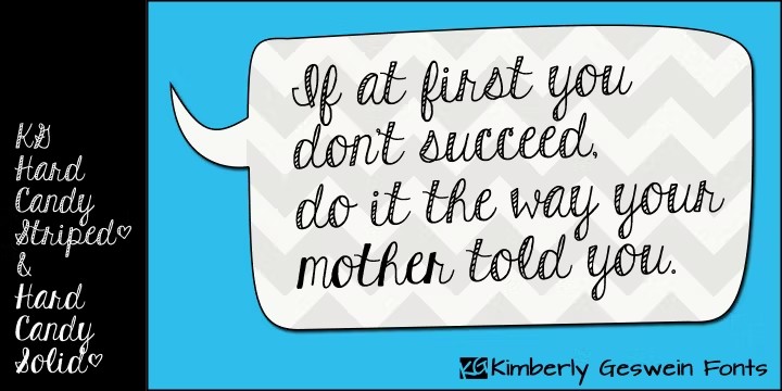Meet KG Hard Candy, a delightful hand-drawn font family that's sure to sweeten up your design game! This charming typeface comes in two styles, offering you plenty of opportunities to get creative. With its playful, whimsical vibe, KG Hard Candy is perfect for adding a touch of personality to your next project - whether it's a blog post, social media graphic, or even a children's book. Published by Kimberly Geswein Fonts, this font family is sure to bring a smile to your face and inspire your inner creative to come out and play!