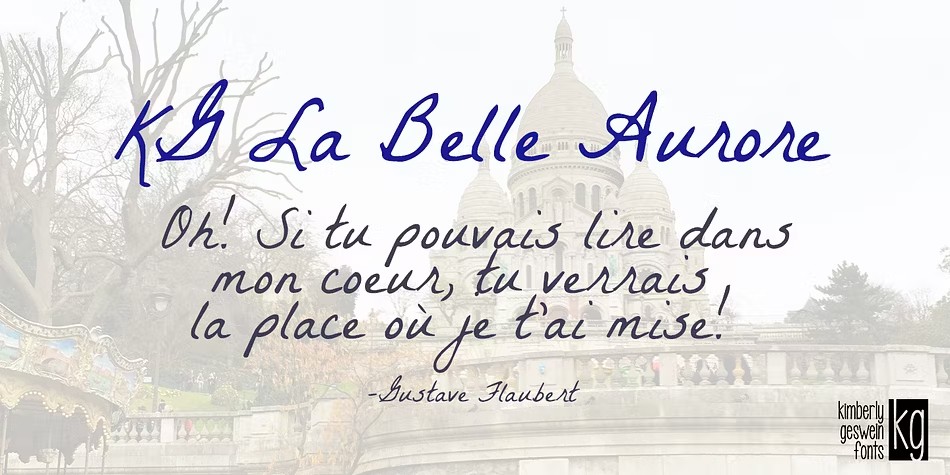 Get ready to be charmed with KG La Belle Aurore, a lovely script font that's sure to capture hearts! This elegant typeface is the perfect choice for creating beautiful handwritten-style text that exudes warmth and sophistication. With its flowing curves and subtle flair, it's ideal for use in wedding invitations, greeting cards, or any project where you want to convey a sense of romance and whimsy. Whether you're designing for a special occasion or just want to add a touch of magic to your everyday writing, KG La Belle Aurore is sure to be a hit!