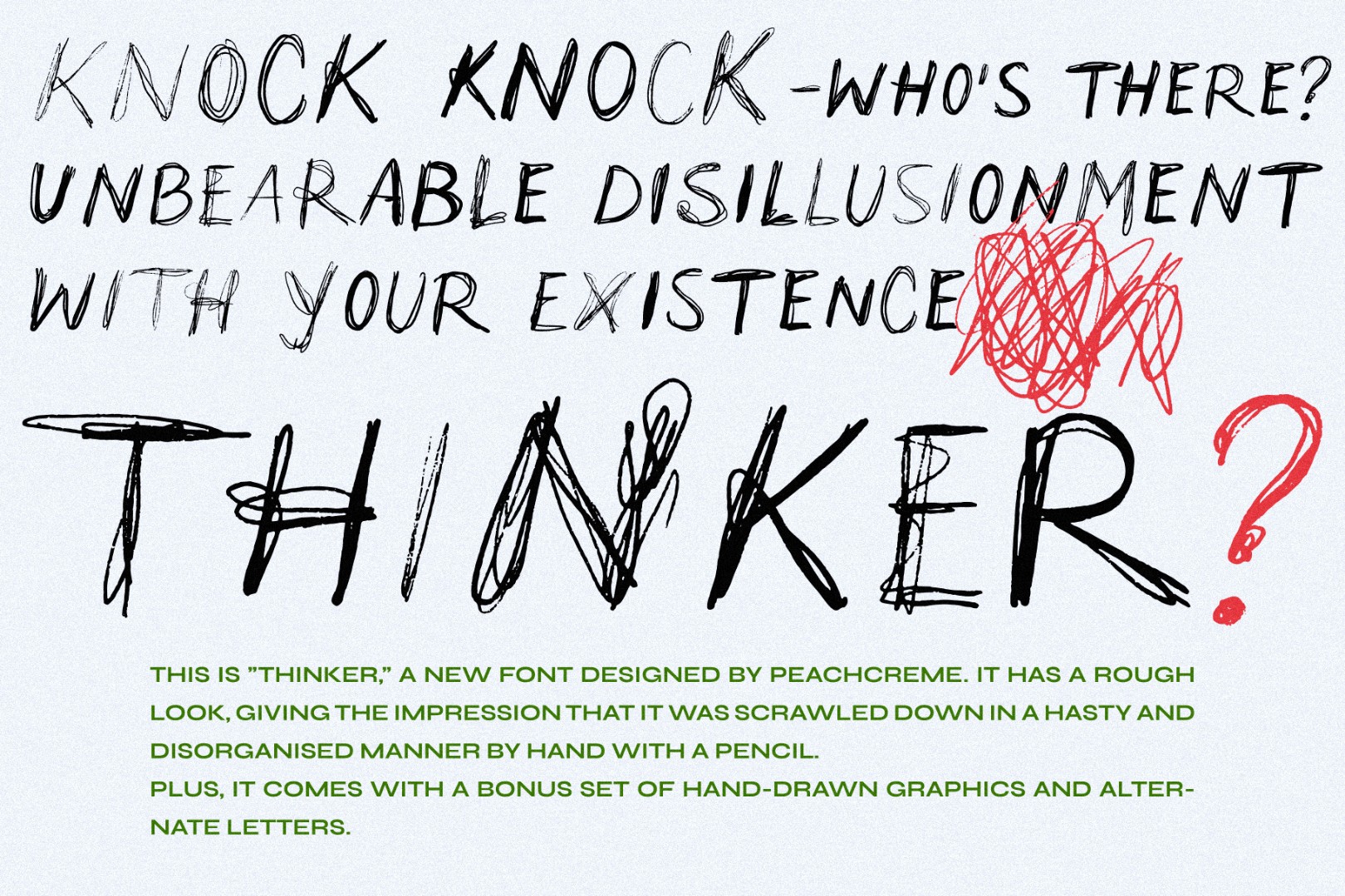 Meet "Thinker", a unique and rough-around-the-edges font that gives the impression of being scrawled down by hand with a pencil. Its hasty and disorganised look adds a touch of personality to any text, making it perfect for those who want to add a little bit of chaos to their design. Plus, you'll also get a bonus set of hand-drawn graphics and alternate letters to mix things up even further. With files included in OTF, TTF, WOFF, and WOFF2 formats, as well as special alt1 and alt2 versions, you'll have plenty of creative options at your fingertips. Happy creating!