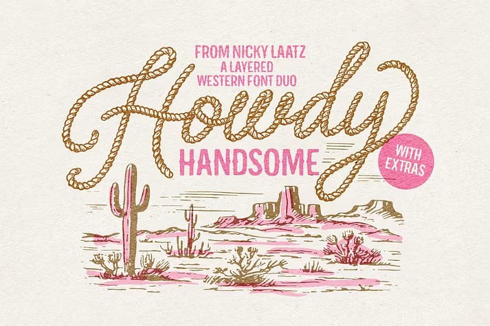 Meet Howdy Handsome, a layered western font duo that's perfect for adding a touch of cowboy charm to your designs. This fantastic set includes a Splendiferous Rope Script with 17 layering and style options, plus plenty of OpenType alternate characters, ligatures, and swashes to help you create unique and eye-catching typography. To balance out the script, an upright version is also included. Additionally, you'll find a Complimentary All-Caps Western Sans Serif with 9 layering and style options, as well as a slanted/oblique version for added flair. And if that's not enough, the "Ranchy Extras" collection provides a range of western graphics vectors to inspire your creativity. With a handy reference sheet to help you quickly find the styles you want, Howdy Handsome is sure to become your go-to font for all things cowboy-themed.