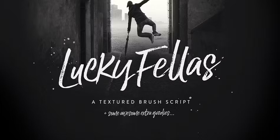 Meet Lucky Fellas, a hand-brushed script with a rough-around-the-edges charm that's full of character! This unique typeface is brought to life through the magic of OpenType features, which allow for stylistic alternates in lowercase letters and comprehensive ligatures that add a touch of realism. The font family also includes a textured titling sans-serif companion, perfect for adding a touch of sophistication, as well as some sassy swashes and splatters to give your designs an extra pop of personality. With its edgy lines and natural flair, Lucky Fellas is the perfect choice for anyone looking to add some attitude to their typography.