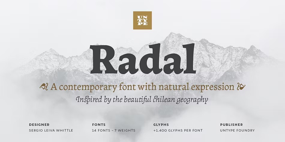 Radal is an expressionist typeface that has captured the attention of the Latin American type scene. Inspired by the dramatic landscapes of southern Chile, designer Sergio Leiva created a humanist font with an unpredictable mix of forms and proportions. While it may seem chaotic at first glance, Radal finds its balance in long text settings, evoking a sense of calm wilderness. But when used on display, its irregular nature shines through, featuring plenty of unexpected forms and counterforms. The Radal family consists of 7 styles, matching italics, and over 1400 glyphs, packed with ligatures, alternates, swashes, ornaments, small caps, symbols, and a treasure trove of typographic resources to delight in.