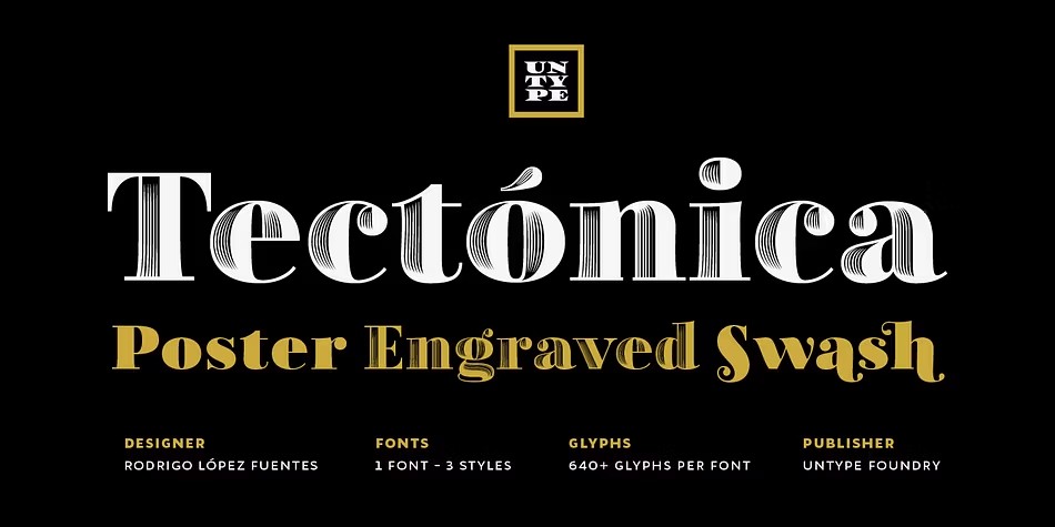 Tectónica is a stunningly elegant typeface that exudes stability and sophistication. Available in three unique styles - Poster, Engraved, and Swash - each boasts its own distinct character, from the strong and sober to the fancy and classic. With heavy contrast and solid presence, Tectónica makes a bold statement, yet its delicate details and variations add a touch of refinement. Designed specifically for headings, logotypes, large text settings, and display use, this font is perfect for making a well-founded and firm yet graceful and refined statement.