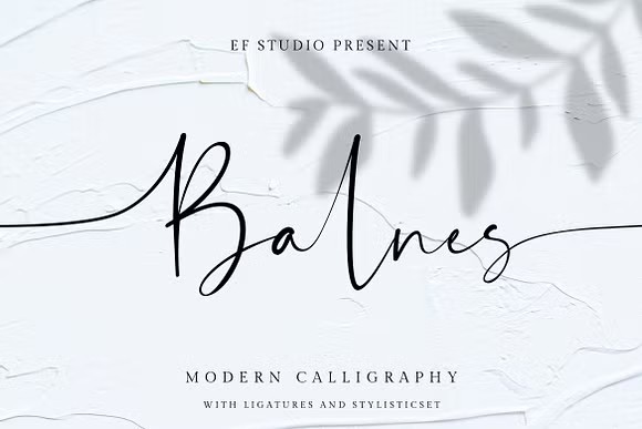 Balnes is a modern font that exudes sophistication and elegance through its script style, complete with ligatures and stylistic sets that add a unique touch. Perfect for making an impression in various applications such as branding, invitations, watermarks, photography, labels, and even movie posters. This versatile font comes with a comprehensive set of upper and lower case letters, multilingual symbols, numbers, and punctuation, ensuring it's suitable for a wide range of uses.