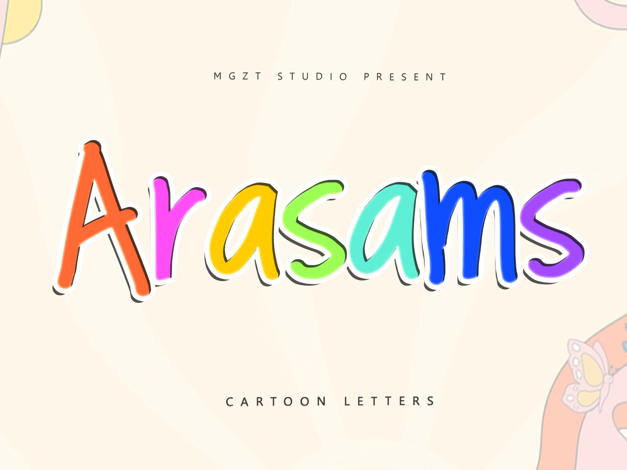 Arasams is a playful and whimsical font that captures the essence of childhood joy. With its comic flair and cheerful aesthetic, this delightful typeface is ideal for kids' projects and designs that aim to evoke a sense of fun and creativity. The font's charming characters encourage imaginative design, making it perfect for children's books, playful posters, and vibrant graphics. Let Arasams inspire your creativity and transform your projects into a world filled with whimsy and laughter.