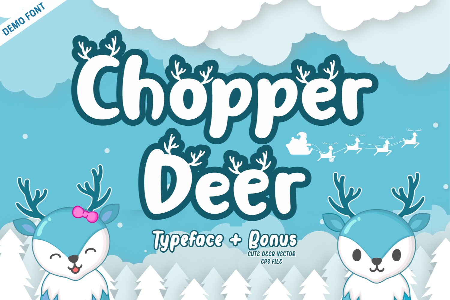 Chopper Deer Demo is a joyful display font that embodies the spirit of the holidays. Its whimsical design features rounded, bouncy characters adorned with playful antlers, making it a perfect choice for festive projects like Christmas cards and children's books. The font's friendly and fun aesthetic is sure to bring warmth and smiles to your creative endeavors. Along with the font, you will also receive a bonus vector pack of adorable deer illustrations, ideal for enhancing your seasonal designs. Embrace the magic of winter with Chopper Deer Demo and let your creativity shine!
