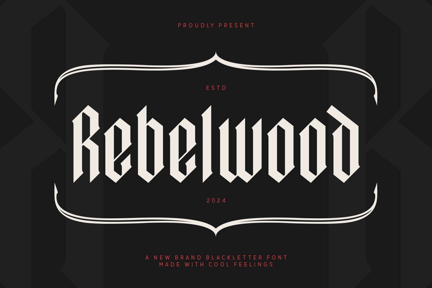 Rebelwood is a delightful blackletter font that masterfully blends the sophistication of traditional Gothic script with a playful, whimsical flair. Its ornate letterforms are infused with fun and approachable design elements, making it perfect for creative and engaging applications. Whether you're designing music albums that blend classic and contemporary styles or creating merchandise like T-shirts, hats, and accessories, Rebelwood's unique charm is sure to capture attention. Its lighthearted personality shines through in every stroke, making it an excellent choice for projects that require a touch of nostalgia and a dash of fun.