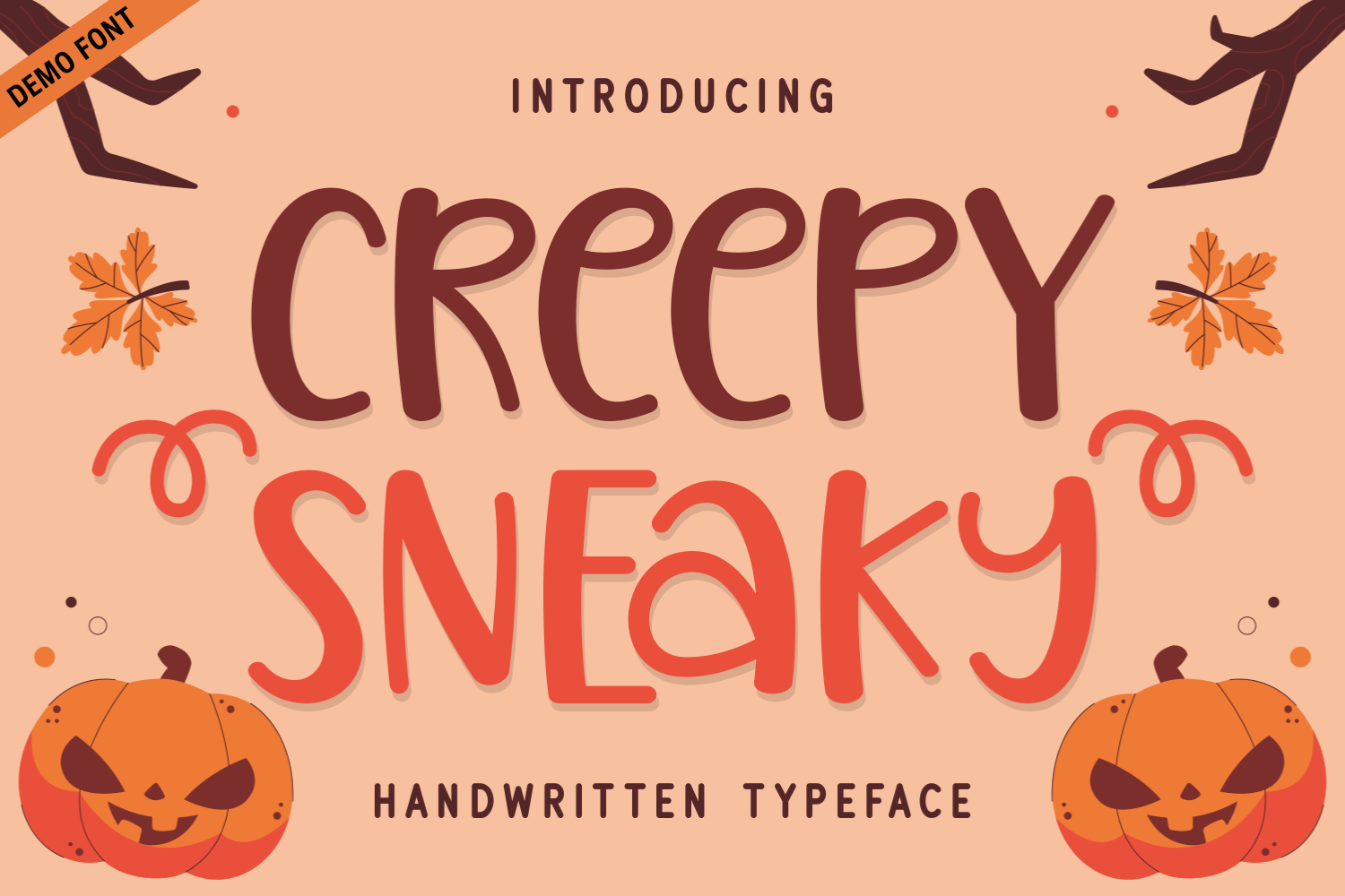 Creepy Sneaky is a whimsical handwritten font that embodies the fun and playful spirit of Halloween. Its quirky curves and uneven strokes create a lively energy, making it ideal for designs that need a touch of character and charm. Perfect for invitations, posters, and children's books, this font captures a delightful blend of spookiness and mischief. With its friendly yet slightly eerie letterforms, Creepy Sneaky invites creativity while maintaining an inviting and warm feel, suitable for various festive projects.