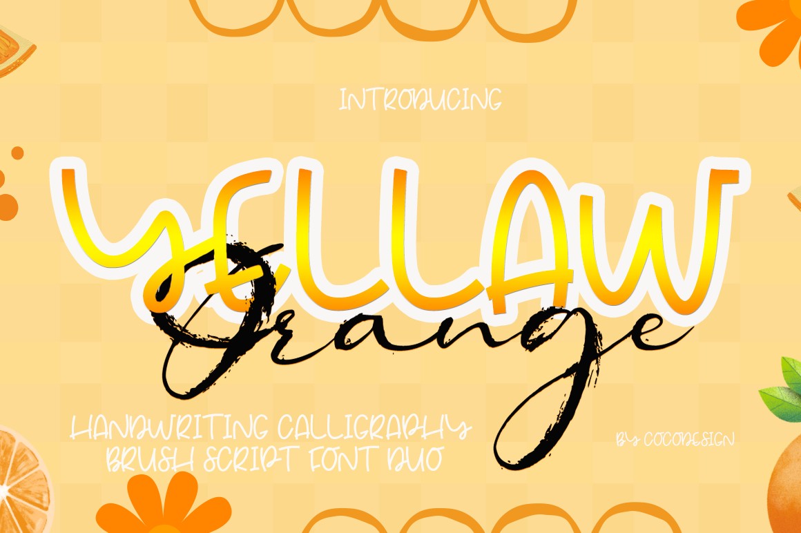 Introducing the "Yellaw Orange Font Duo," a charming pair of handcrafted fonts designed to bring your creative ideas to life. This captivating duo is perfect for adding a touch of personality to everything from product promotions and logos to wedding invitations and book covers. Whether you're looking to create standout headlines, design eye-catching signage, or add a touch of elegance to your quotes, these fonts are an expressive tool that can help you elevate your branding and make it truly unique. With the Yellaw Orange Font Duo, you'll have everything you need to spark your creativity and bring your vision to life.