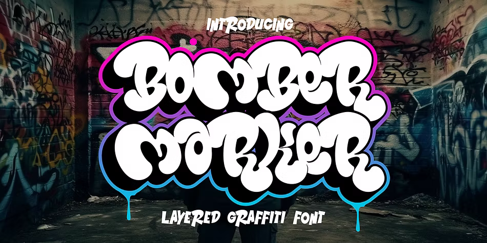 Bomber Marker is a bold and eye-catching graffiti font with a distinct urban flair. This font features two layers—Solid and Shadow—adding depth and dimension to your designs. It’s perfect for streetwear, album covers, posters, and any project requiring a playful yet rebellious character. The thick, hand-drawn strokes and quirky details of Bomber Marker ensure that your text stands out, making it a fantastic choice for capturing the essence of street art and culture. Whether for branding or personal projects, this font brings a fun and energetic vibe that resonates with urban creativity.