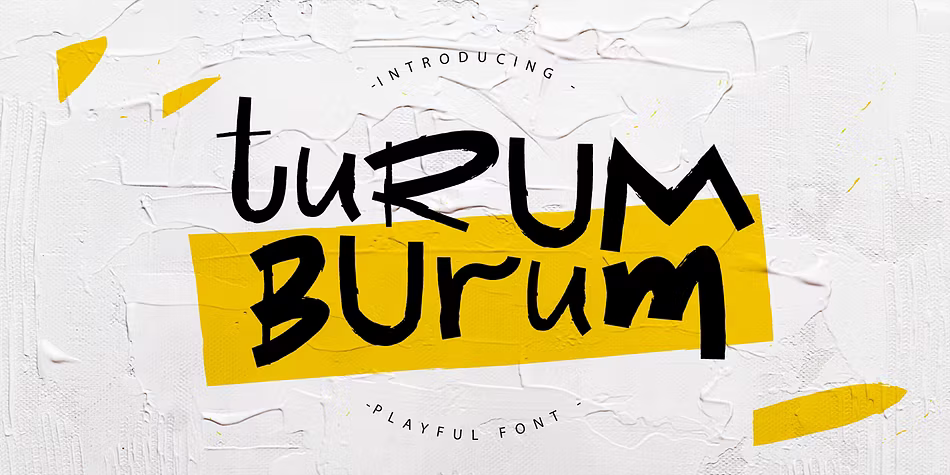 Turum Burum is a whimsical hand-drawn font that radiates a playful vibe. It features uppercase and lowercase letters, a variety of punctuation marks, and supports multiple languages, making it versatile for many design projects. This font is perfect for creating logos, quotes, posters, and branding elements. Its fun and quirky style adds a unique touch, ensuring that your designs stand out. With its friendly appearance, Turum Burum is an excellent choice for any graphic design that aims to convey joy and creativity, capturing the essence of lighthearted artistry.