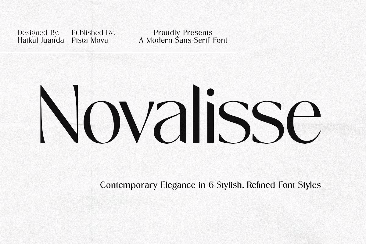 Novalisse is an elegant sans serif typeface that marries classic charm with modern sensibility. With high-contrast strokes and graceful curves, it captivates the eye and enhances any design. This versatile font is suitable for sophisticated editorial layouts, striking brand identities, and engaging websites. Each character is meticulously crafted to convey strength and refinement, while the true italics add dynamic movement. With elegant ligatures and multilingual support, Novalisse is perfect for editorial design, branding, web design, packaging, and stationery. Experience the seamless blend of elegance and functionality that Novalisse brings to your creative projects.